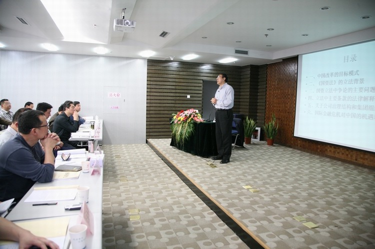 劉紀鵬教授對中國改革的目標模式、國資改革中的政府定位、《國有企業(yè)資產(chǎn)法》的立法背景、立法中爭論的主要問題、主要條款的法律解釋等問題做了深入的講解,并對參會人員提出的疑問做了認真的解答。此外,他還就國際金融危機對中國發(fā)展的機遇和挑戰(zhàn)提出了自己的獨到見解。