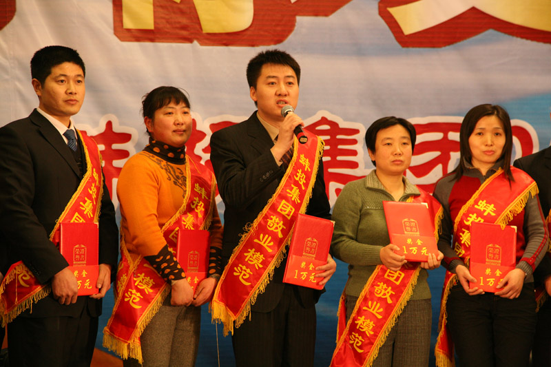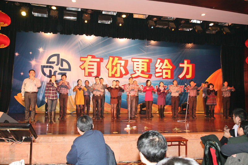 酒會上,公司表彰了2010年度6名創(chuàng)新標(biāo)兵和32名敬業(yè)模范,公司領(lǐng)導(dǎo)分別為敬業(yè)模范頒發(fā)證書和獎金,張孝成副市長為創(chuàng)新標(biāo)兵頒發(fā)證書、獎金并致辭,肖超秘書長、創(chuàng)新標(biāo)兵及敬業(yè)模范抽出19名幸運(yùn)的獲獎員工,為大家呈上了精神大餐和物質(zhì)大餐;著名喜劇表演藝術(shù)家陳佩斯領(lǐng)銜主演的話劇《雷人晚餐》在蚌埠大劇院隆重上演,員工們在酒會上獻(xiàn)出精彩紛呈的歌舞表演,為集團(tuán)員工及珠城人民奉上文化大餐。與會人員舉杯同飲,共慶農(nóng)歷新年的到來。