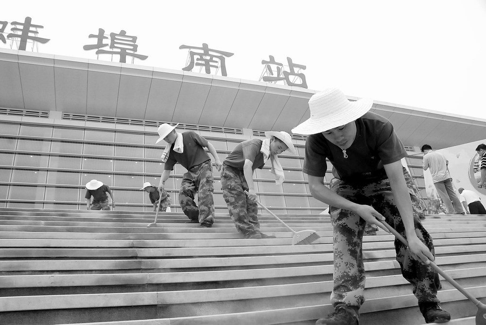 6月28日上午,解放軍汽車管理學(xué)院組織200余名官兵清掃高鐵蚌埠南站站前廣場,為第二故鄉(xiāng)建設(shè)做貢獻(xiàn)。