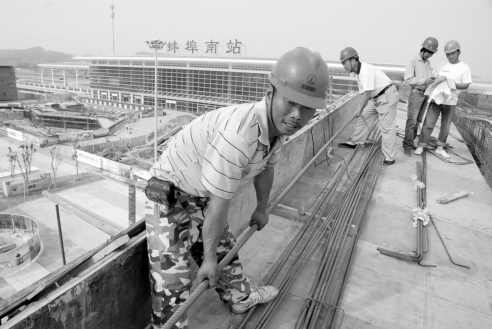 7月13日,施工人員在進(jìn)行蚌埠南站配套服務(wù)樓屋頂鋼筋綁扎施工。據(jù)了解,高鐵蚌埠南站配套服務(wù)樓主體施工進(jìn)入尾聲,16日將開始進(jìn)行混凝土澆灌封頂施工。