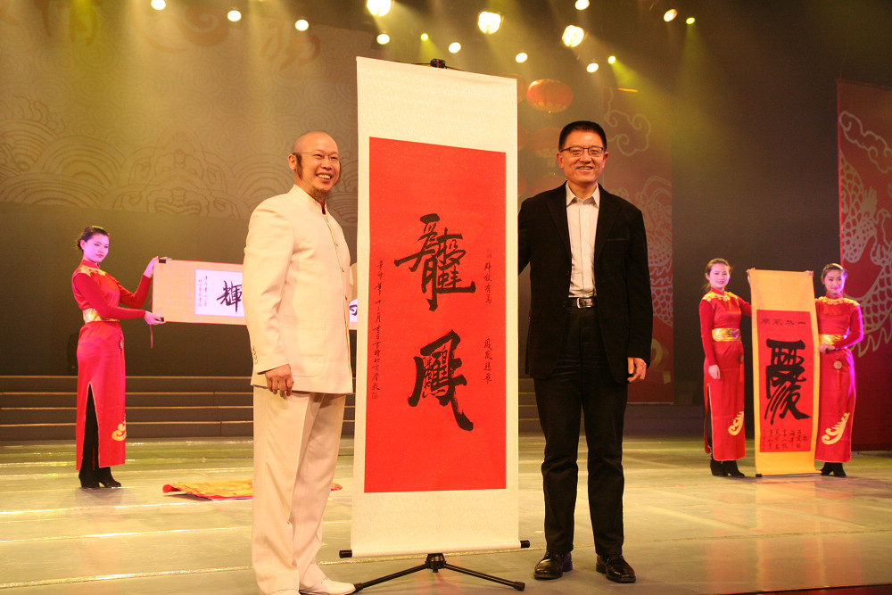 副市長(zhǎng)江婭致詞 以沙畫的形式表現(xiàn)集團(tuán)的發(fā)展 奇人書法家贈(zèng)送書法作品(蚌投有為 鳳凰騰飛) 邀請(qǐng)嘉賓鞏漢林、金珠表演精彩節(jié)目