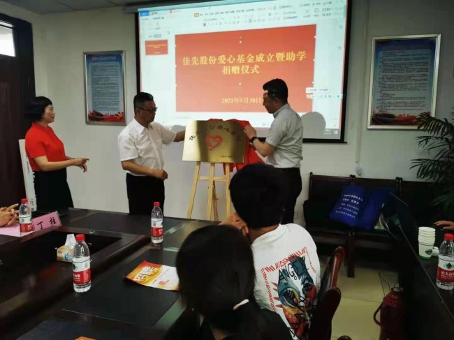 儀式現(xiàn)場,佳先股份副總經(jīng)理、工會主席丁柱介紹了公司發(fā)展及參與公益事業(yè)的情況;區(qū)委常委、常務(wù)副區(qū)長程旭和佳先股份董事長李兌共同為“佳先股份愛心基金”揭牌;佳先股份愛心基金向沫河口鎮(zhèn)學(xué)生捐贈10萬元。