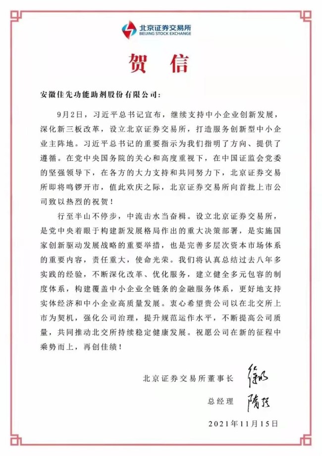 11月15日,蚌投集團(tuán)旗下安徽佳先功能助劑股份有限公司正式成為全國(guó)首批北京證券交易所上市企業(yè)。北交所就佳先股份上市發(fā)來(lái)賀信。