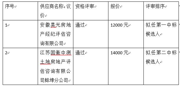 高鐵蚌埠南站西廣場、蚌投科技園物業(yè)服務(wù)費評估項目于2021年10月18日發(fā)布招標(biāo)公告,經(jīng)兩次流標(biāo),第三次招標(biāo)公共于2021年11月04日發(fā)布,2021年11月11日9:00本項目開標(biāo),三家報名現(xiàn)場兩家參與,按招標(biāo)文件要求現(xiàn)場議價,經(jīng)過專家評審,經(jīng)與投標(biāo)單位溝通均表示不再下浮,按招標(biāo)文件要求符合議價程序?,F(xiàn)公告排名如下: