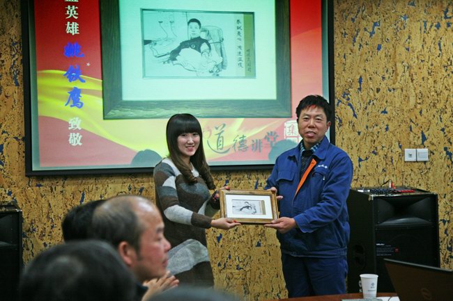 在學(xué)模范環(huán)節(jié),我們的“身邊人”—來自公司系統(tǒng)中環(huán)水務(wù)有限公司的蚌埠助人為樂好人姚鐵鷹,講述他十年義務(wù)獻(xiàn)血2萬5千毫升的感人事跡。在活動(dòng)現(xiàn)場(chǎng),公司向姚鐵鷹贈(zèng)送了由志愿者們制作的記錄他獻(xiàn)血義舉時(shí)的肖像,并向全體職工倡議:向蚌埠好人姚鐵鷹學(xué)習(xí),將志愿服務(wù)化作自覺行為和生活方式。
