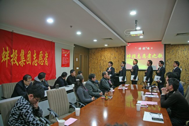 在談感悟環(huán)節(jié),主持人介紹了近期公司志愿者注冊(cè)登記工作開展情況,宣布成立蚌投集團(tuán)志愿服務(wù)隊(duì)。在本環(huán)節(jié)中, 6名志愿者現(xiàn)場(chǎng)為大家?guī)砹嗽姼枥收b——《蚌投志愿者之歌》并莊嚴(yán)宣誓。